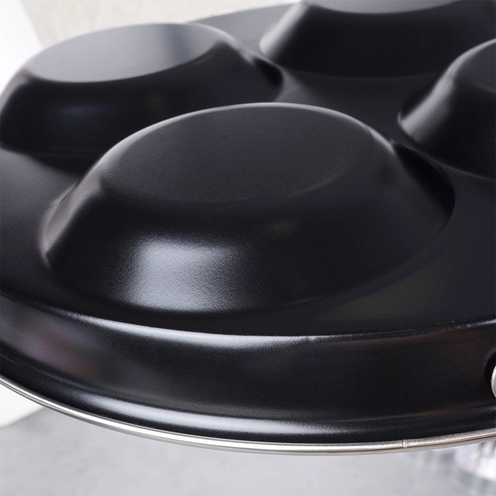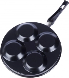 Cztery okrągłe zagłębienia o średnicy 8 cm zapewniają równy kształt i wypieczenie każdego jajka lub racucha – idealne na szybkie i estetyczne śniadanie.