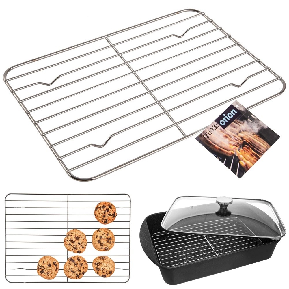 Uniwersalny metalowy ruszt do brytfanny i kratka do studzenia w jednym o wymiarach 32 × 23 × 1,2 cm. Świetnie sprawdzi się do pieczenia mięsa bez nadmiaru tłuszczu, do studzania i dekorowania tortów oraz ciasteczek, a także jako podkładka termiczna pod gorące naczynia. Wykonany z chromowanego drutu stalowego dla długiej żywotności.