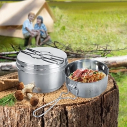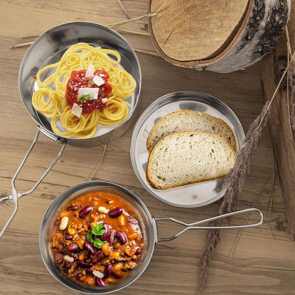 Ta 3‑częściowa kempingowa menażka ze stali nierdzewnej oferuje wszystko, czego potrzeba do serwowania posiłków w podróży. Po rozłożeniu otrzymasz dwa małe rondelki oraz pokrywkę / talerz do wygodnego nakładania i podawania. Dzięki składanym uchwytom cały zestaw łatwo mieści się w plecaku i jest gotowy na każdą przygodę.