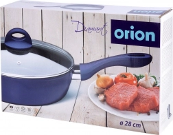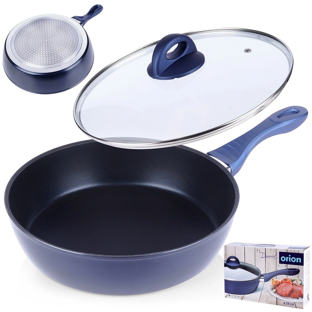 Wysokiej klasy głęboka patelnia o średnicy 28 cm ze szklaną pokrywką oferuje diamentową, nieprzywierającą powłokę bez PFOA i PTFE, szybkie i równomierne rozprowadzanie ciepła, oszczędne gotowanie oraz kompatybilność z indukcją. Ergonomiczny uchwyt nie nagrzewa się, a patelnia nadaje się do zmywarki.