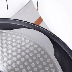 Wytrzymałe aluminiowe korpus z wielowarstwowym dnem jest energooszczędny – straty ciepła są minimalne, a potrawy gotowe szybciej. Patelnię można używać na kuchenkach gazowych, elektrycznych, szklano-ceramicznych oraz indukcyjnych. Ergonomiczny uchwyt z wytrzymałego tworzywa nie nagrzewa się i zapewnia bezpieczny chwyt nawet podczas dłuższego gotowania.