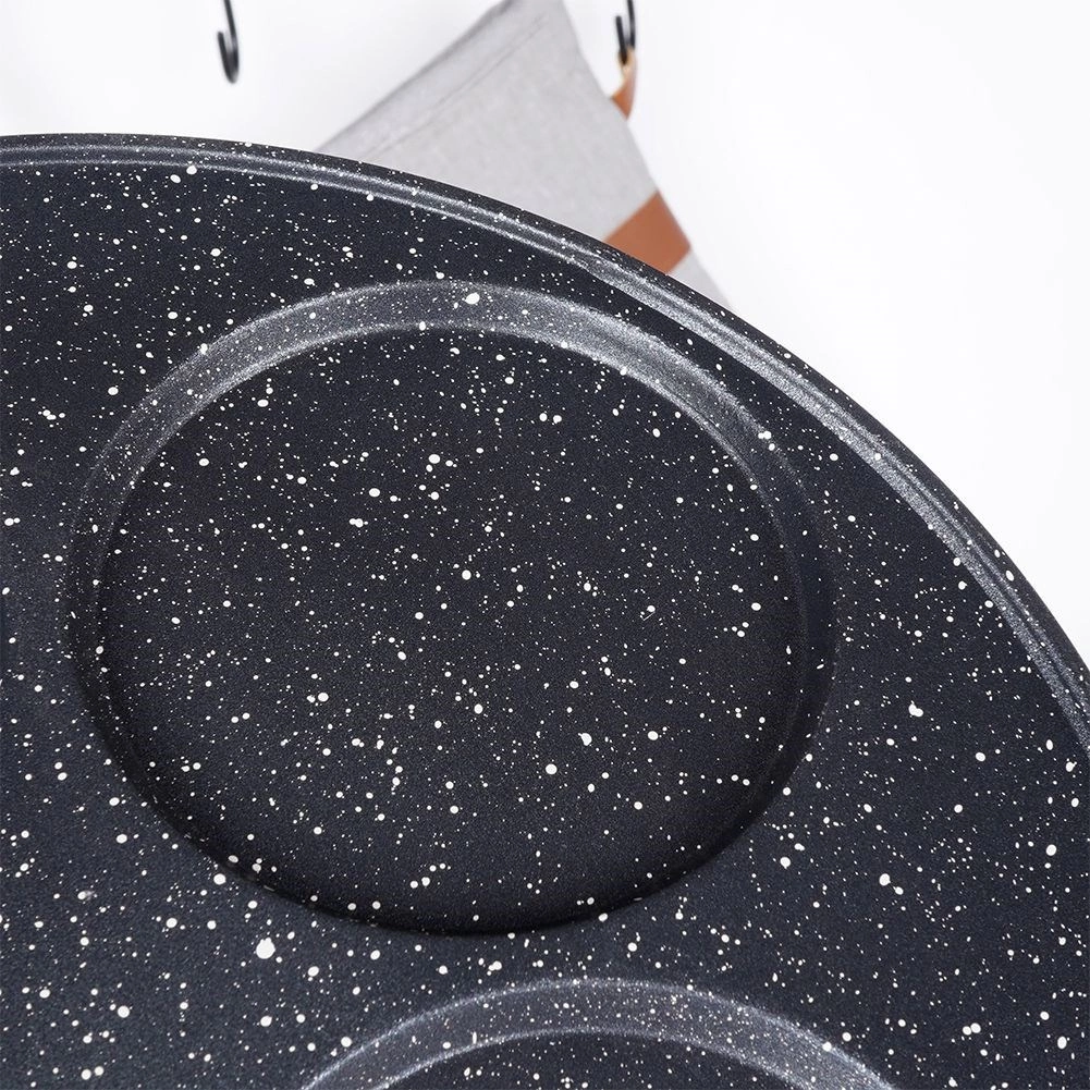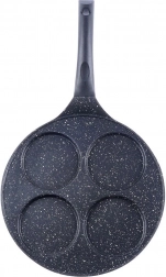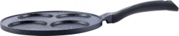 Ta uniwersalna patelnia z 4 okrągłymi formami jest idealna do jajek sadzonych, mini placuszków, placków ziemniaczanych lub małych naleśników. Nieprzywierająca granitowa powłoka Pfluon Granite zapobiega przypalaniu i pozwala smażyć z minimalną ilością tłuszczu. Dzięki równomiernej dystrybucji ciepła zawsze uzyskasz równe i pięknie wypieczone porcje.