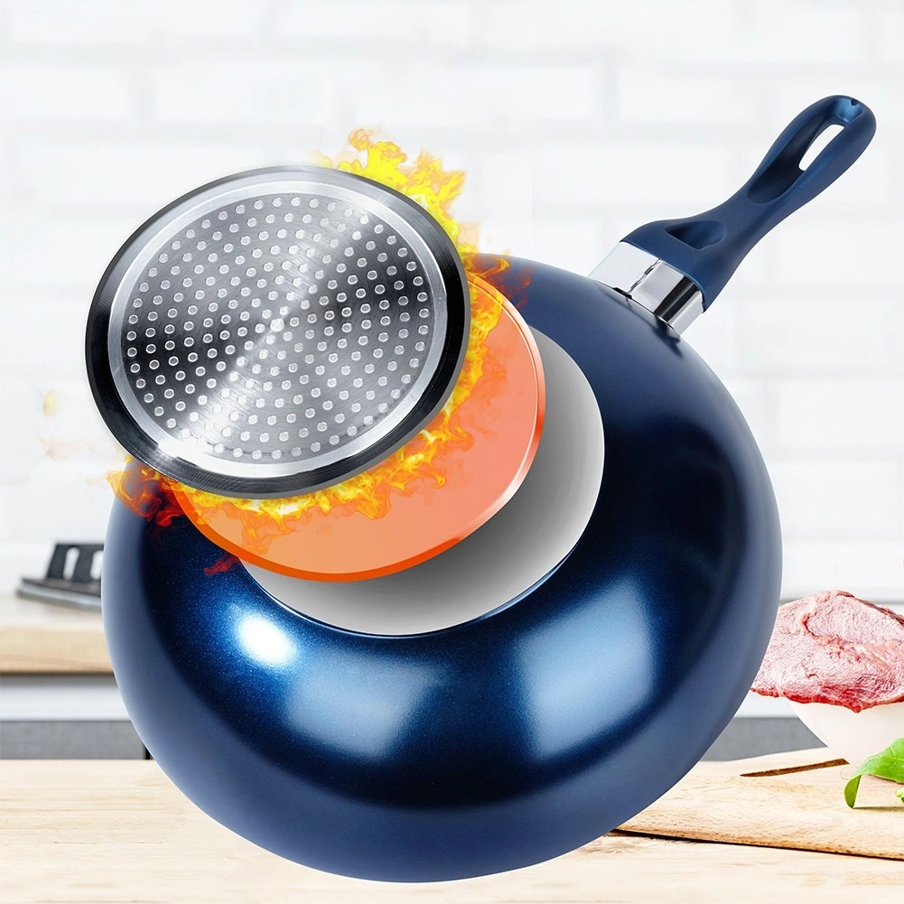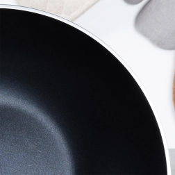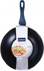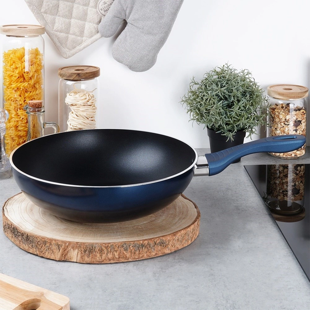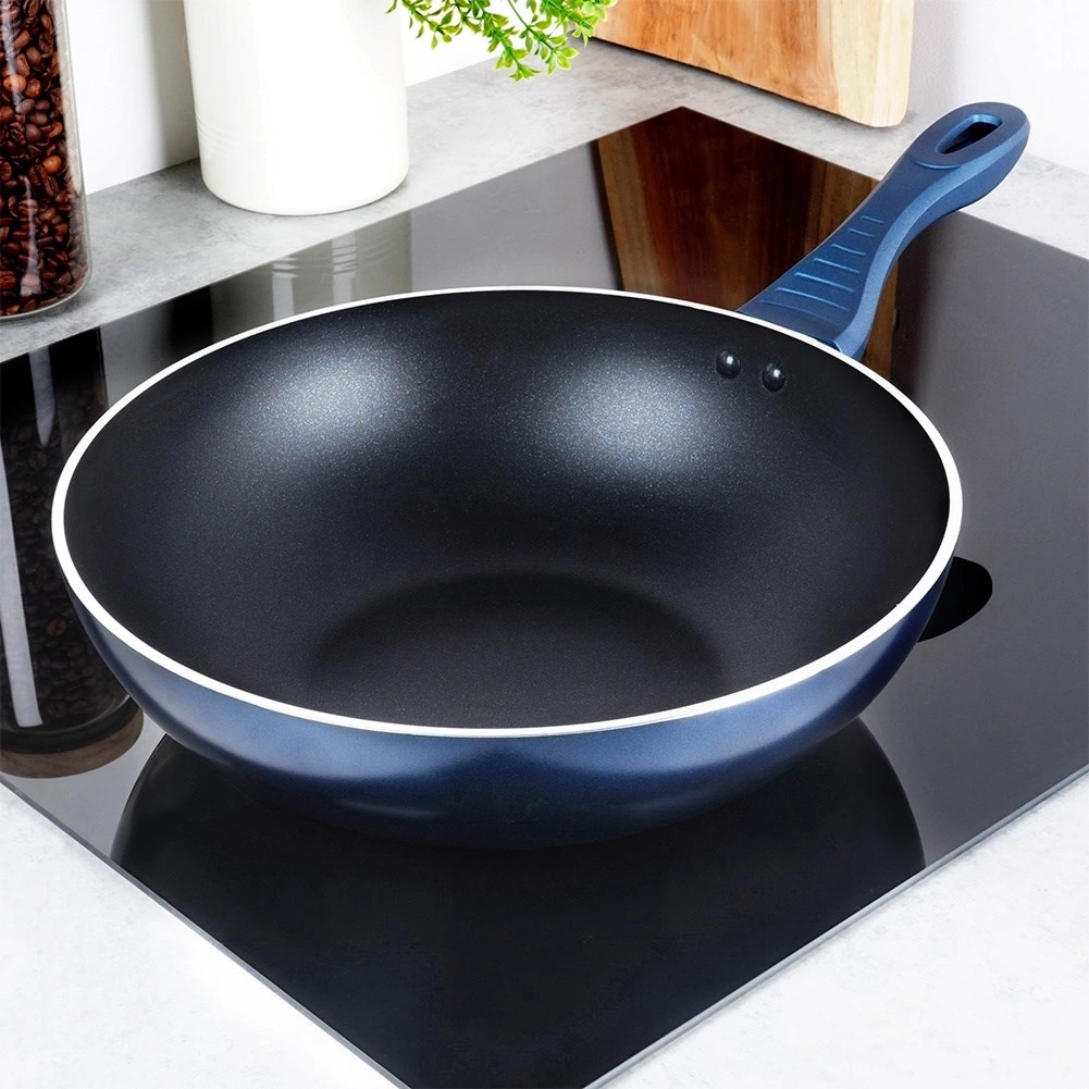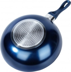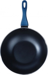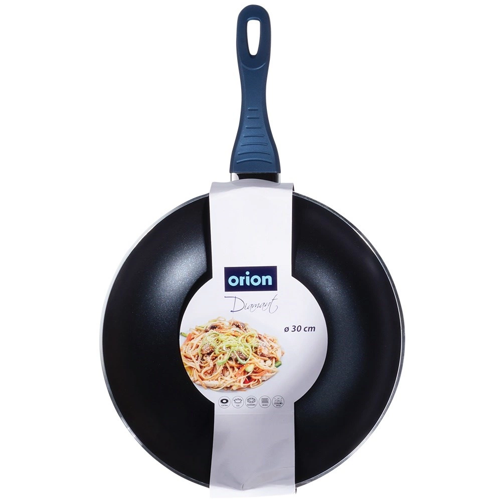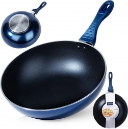 Uniwersalna patelnia wok o średnicy 30 cm z wysoce odporną diamentową, nieprzywierającą powłoką zapewnia szybkie i równomierne gotowanie. Wytrzymałe aluminiowe korpus, dno indukcyjne oraz ergonomiczny, nie nagrzewający się uchwyt w kolorze niebieskim. Odpowiednia na wszystkie typy kuchenek, idealna do niskotłuszczowego smażenia i podsmażania, łatwa w czyszczeniu i nadaje się do zmywarki.