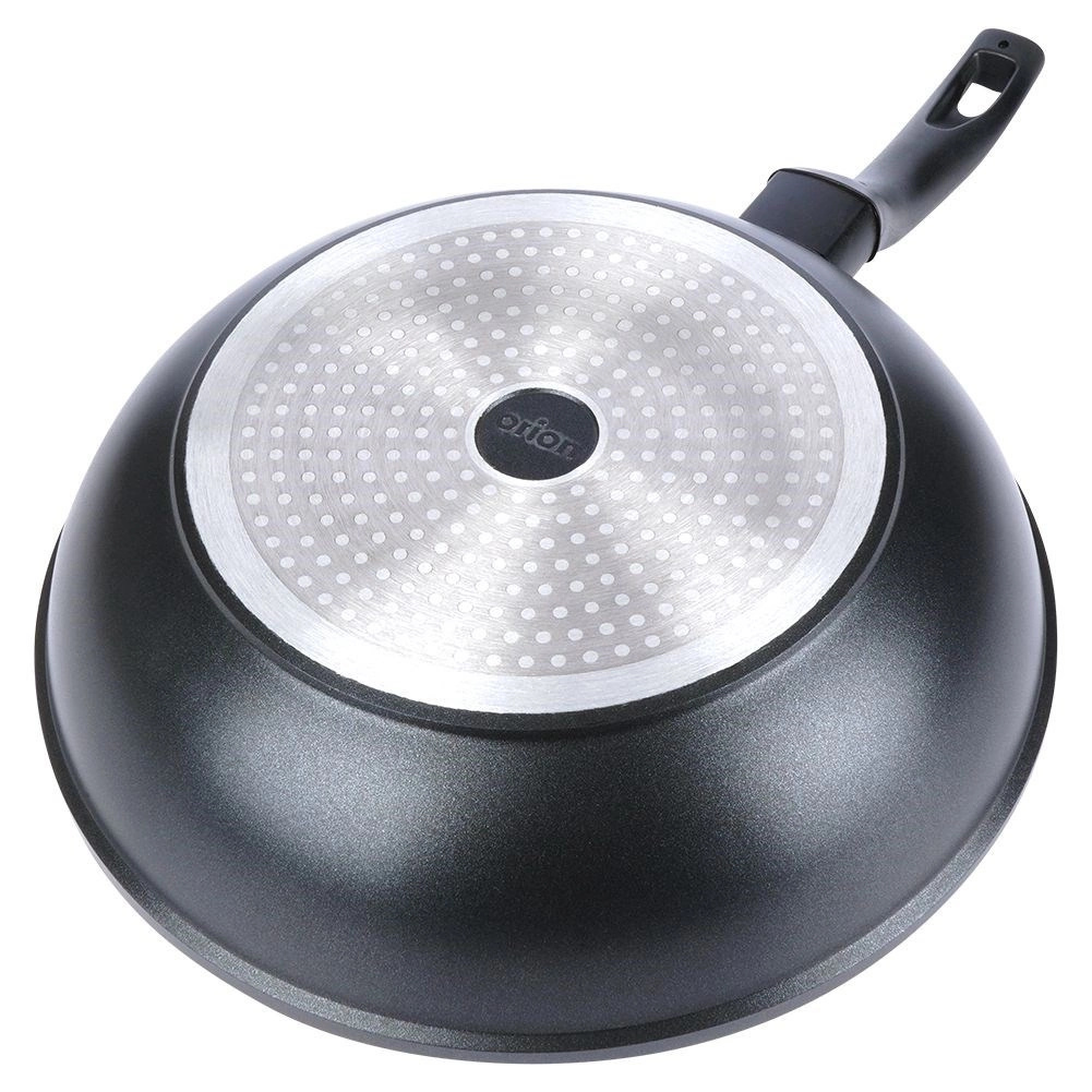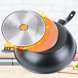Grube, wielowarstwowe dno z płytą indukcyjną efektywnie przenosi ciepło na całej powierzchni, zapewniając doskonałe rezultaty podczas podsmażania i duszenia.