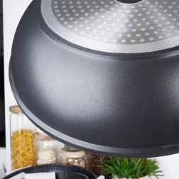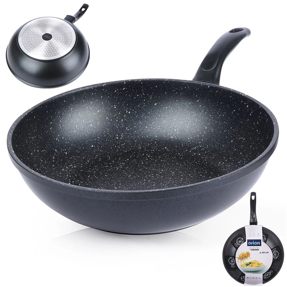 Uniwersalny granitowy wok o średnicy 30 cm z wytrzymałego odlewu aluminiowego do szybkiego i równomiernego gotowania. Dzięki nieprzywierającej, granitowej powłoce bez PFOA i PTFE przygotujesz zdrowe i smaczne potrawy z minimalną ilością tłuszczu. Odpowiedni na gaz, prąd, płytę ceramiczną, halogen oraz indukcję i można go myć w zmywarce.