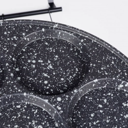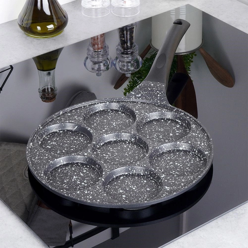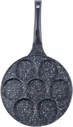 Praktyczna granitowa patelnia o średnicy 27 cm z 7 formami do równych porcji placuszków lub jajek. Trwała nieprzywierająca powłoka Pfluon umożliwia zdrowe gotowanie z minimum tłuszczu. Szybkie i równomierne rozprowadzanie ciepła oszczędza czas i energię, odpowiednia do wszystkich typów kuchenek, w tym indukcji. Bez PFOA i PTFE, z wygodną nienagrzewającą się rączką.