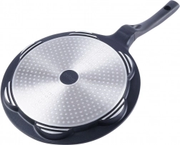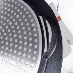Aluminiowy korpus o doskonałym przewodnictwie rozprowadza ciepło po całej powierzchni patelni, co oznacza oszczędność czasu i energii. Patelnia jest kompatybilna z gazem, prądem, płytą ceramiczną i indukcją. Ergonomiczna rączka z wytrzymałego tworzywa nie nagrzewa się, co zapewnia bezpieczną obsługę.