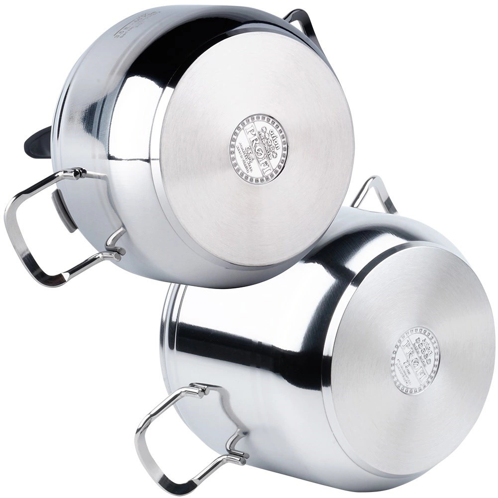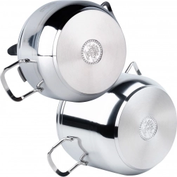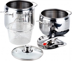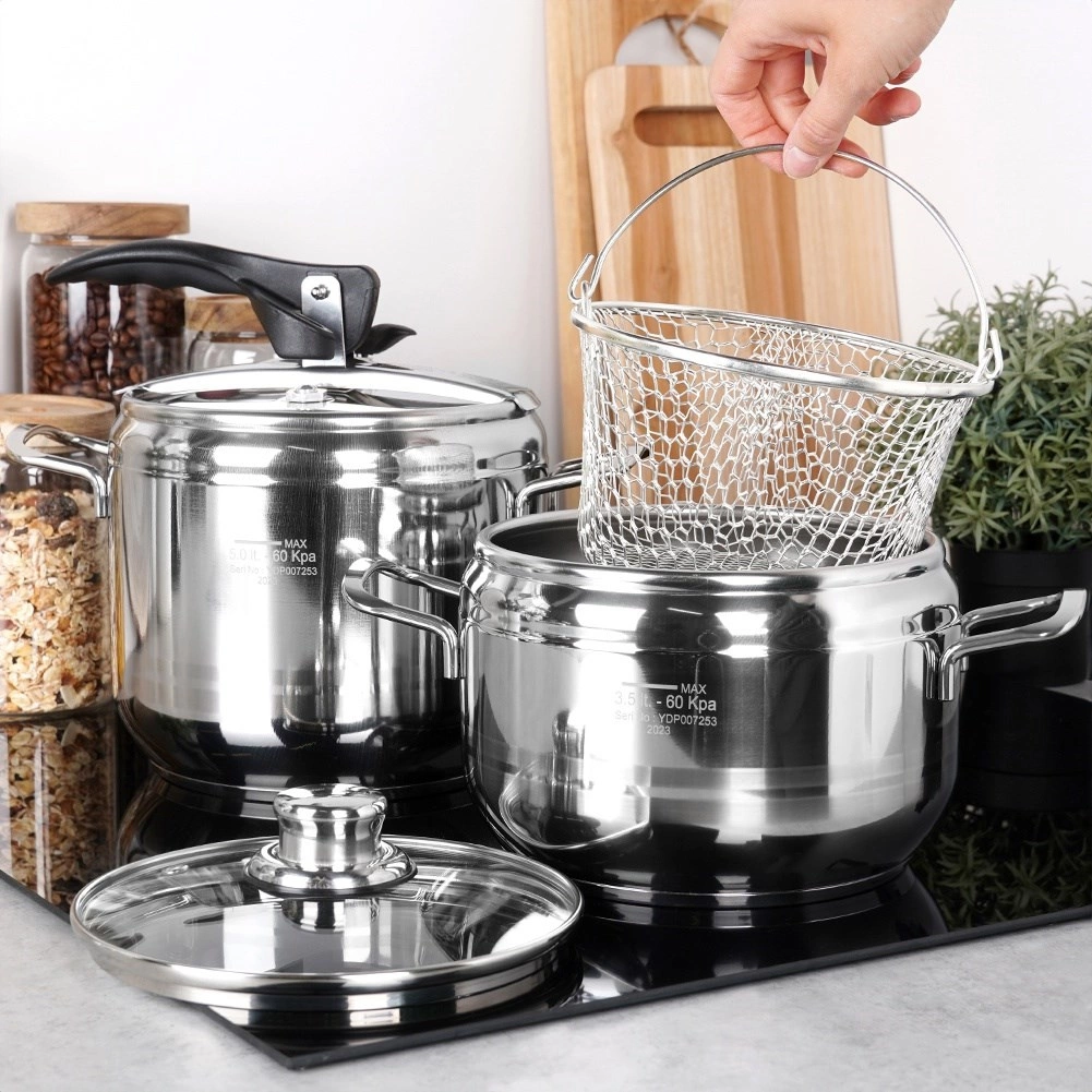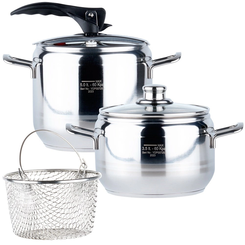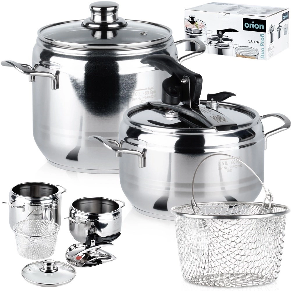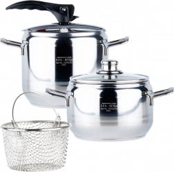 Praktyczny zestaw dwóch nierdzewnych szybkowarów o pojemności 3,5 i 5 l z uniwersalnym zastosowaniem na wszystkich typach kuchenek, w tym indukcyjnych. W zestawie znajduje się pokrywa ciśnieniowa, pokrywa szklana oraz metalowy kosz do gotowania, odcedzania lub fritowania. Grube 3-warstwowe dno zapewnia równomierne rozprowadzanie ciepła, a 2 zawory bezpieczeństwa i regulacja ciśnienia gwarantują spokój podczas gotowania. Dzięki gotowaniu pod ciśnieniem garnek jest szybki i energooszczędny, a bez pokrywy można go łatwo myć w zmywarce.