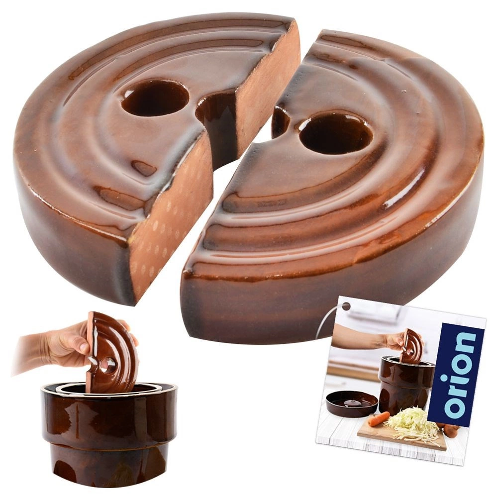 Dwuczęściowa konstrukcja z praktycznymi otworami do chwytania ułatwia manipulację nawet w wąskich szyjkach naczyń do kiszenia. Trwała glazurowana ceramika jest łatwa w utrzymaniu i przy właściwym użytkowaniu posłuży przez lata. Uniwersalna średnica 21 cm pasuje do większości garnków i naczyń do kiszenia.