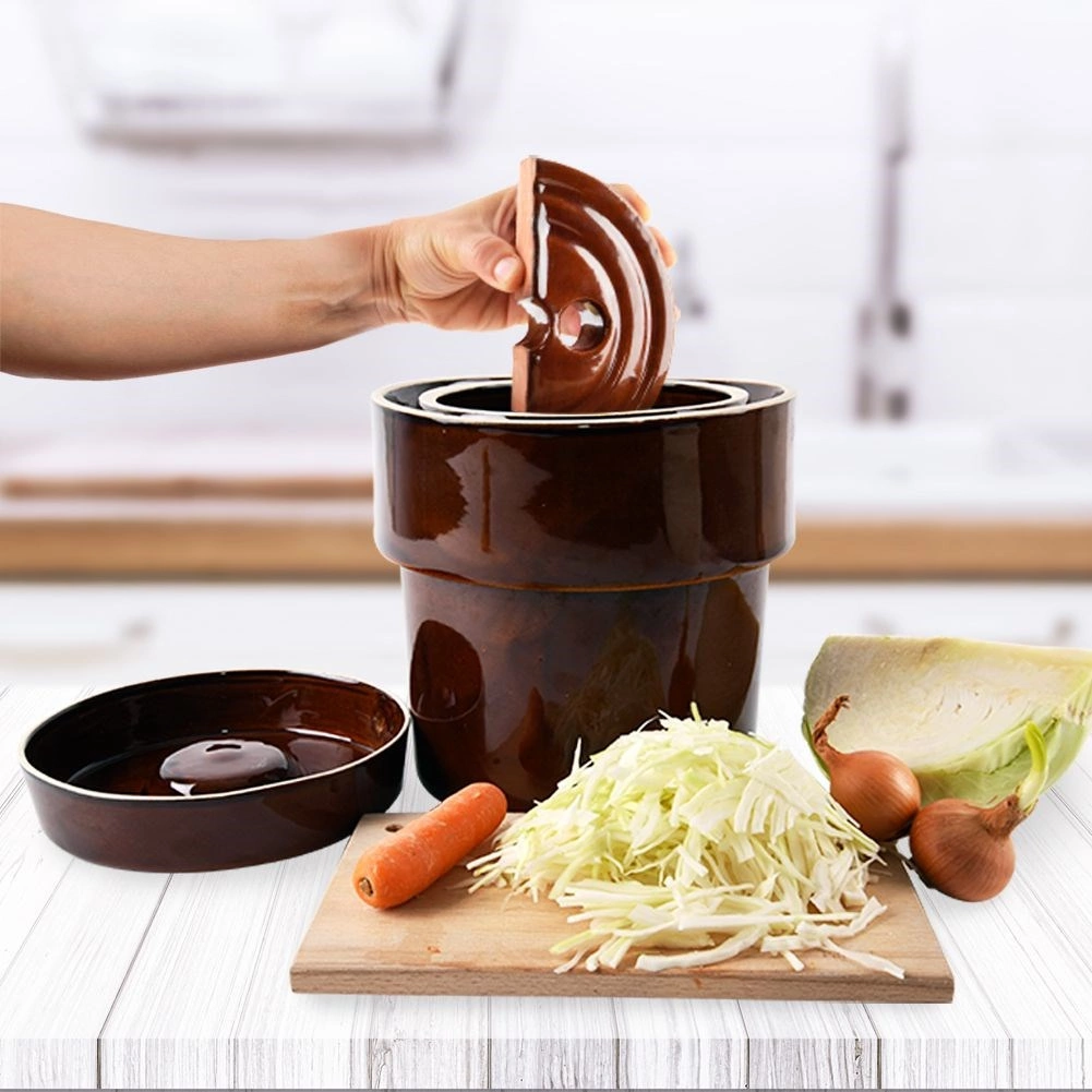 Praktyczny ceramiczny ciężarek do kiszenia o średnicy 21 cm utrzymuje warzywa bezpiecznie zanurzone w zalewie, co zapewnia równomierną fermentację bez pleśni. Solidna ceramika w brązowej glazurze, dwuczęściowa konstrukcja z otworami dla łatwego wkładania i wyjmowania. Idealny do kapusty kiszonej, ogórków i innych warzyw w naczyniach i garnkach do kiszenia.