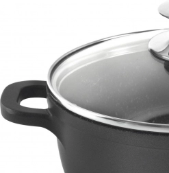 Praktyczny granitowy garnek o pojemności 2,3 l i średnicy 20 cm z wytrzymałą szklaną pokrywką jest idealny do codziennego gotowania i duszenia. Dzięki nieprzywierającej granitowej powłoce PFLUON bez PFOA i PTFE gotujesz zdrowiej, używając mniej tłuszczu. Aluminiowe korpus zapewnia szybkie i równomierne rozprowadzanie ciepła, odpowiedni na wszystkie typy kuchenek, w tym indukcyjne, a także do piekarnika. Pokrywka z zaworem parowym i wygodnymi uchwytami ułatwia obsługę i kontrolę gotowania.