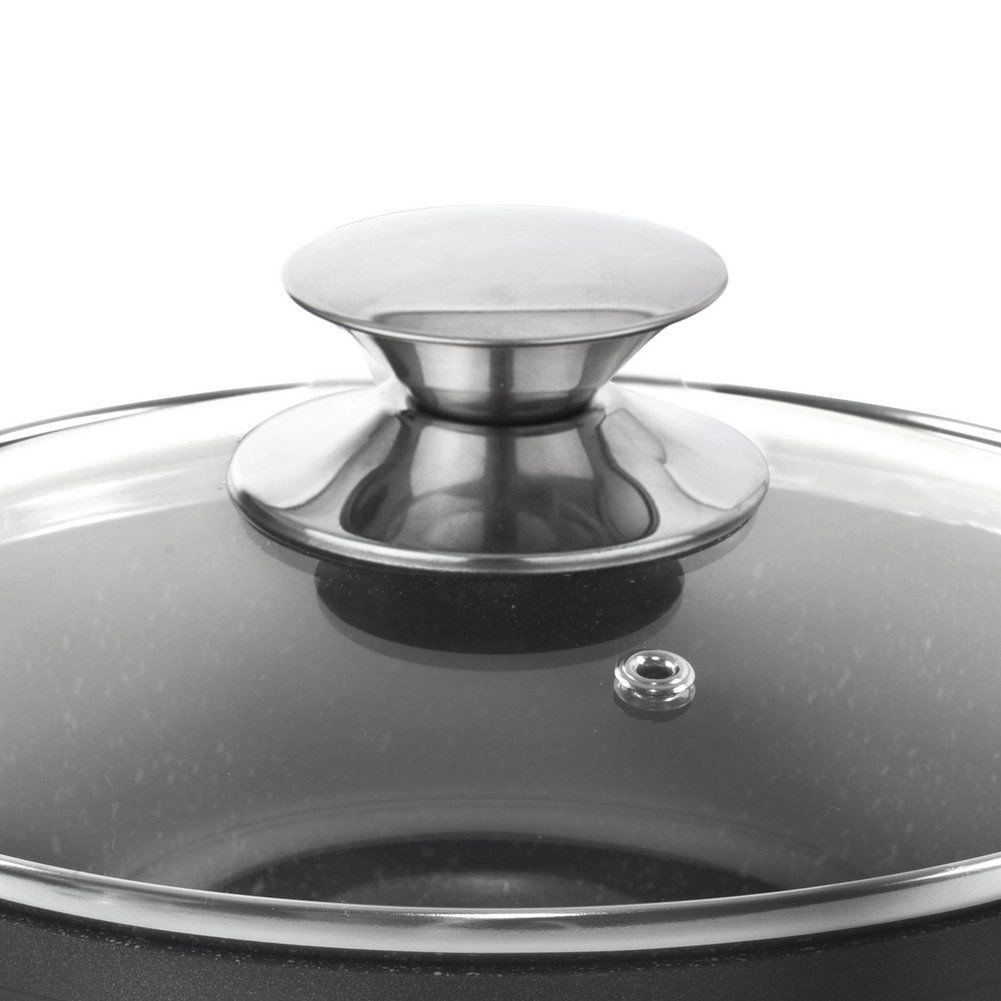 Przezroczysta pokrywka z metalowym uchwytem i zaworem umożliwia kontrolę wrzenia i odprowadzanie nadmiaru pary.