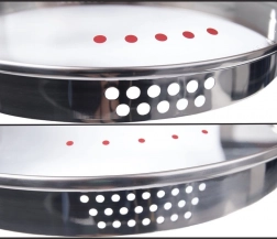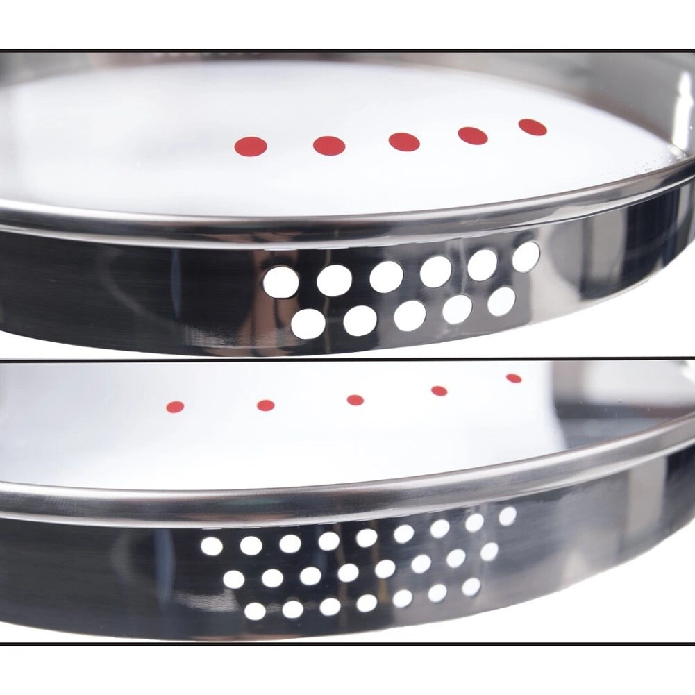 Praktyczna szklana pokrywka z perforowanym rantem utrzymuje składniki w środku i pozwala bezpiecznie oraz wygodnie odlewać wodę bez cedzaka.