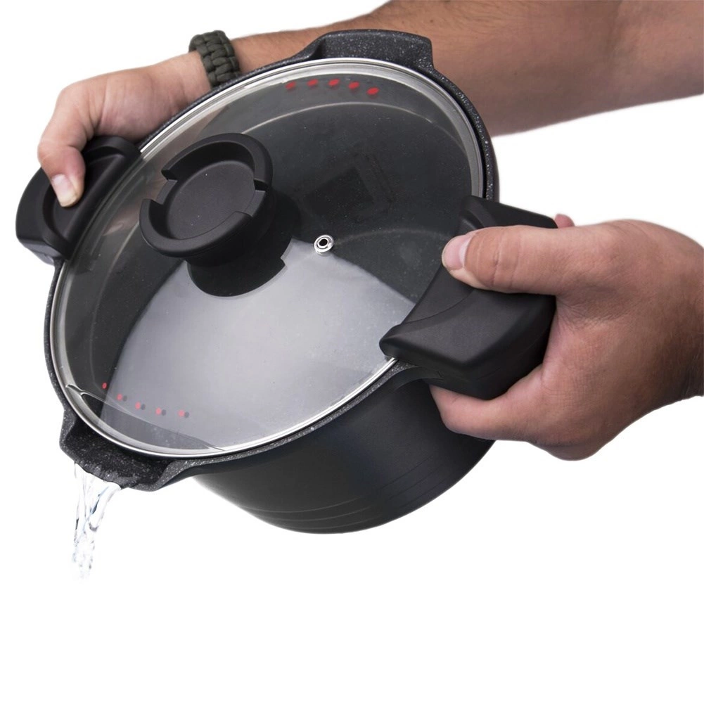 Ergonomiczne, odporne na ciepło uchwyty oraz wylewki w korpusie garnka zapewniają pewny chwyt i kontrolowane odcedzanie.