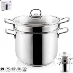 W komplecie znajduje się szklana pokrywka z zaworem dla bezpiecznego ujścia pary oraz ergonomiczna wkładka parowa z perforowanym dnem i wygodnymi uchwytami. Strona zewnętrzna jest wypolerowana na wysoki połysk dla eleganckiego wyglądu i łatwego czyszczenia. Garnek jest kompatybilny ze wszystkimi typami kuchenek, w tym indukcją, i można go myć w zmywarce.