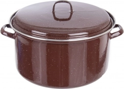 Ta uniwersalna pokrywka wykonana jest z wysokiej jakości emaliowanej stali w eleganckim brązowym kolorze z delikatnym kropkowanym wzorem. Pasuje do naczyń o średnicy 32 cm, a dzięki solidnemu uchwytowi wygodnie się nią manewruje. Emalia jest higieniczna, bezpieczna dla zdrowia i odpowiednia także dla alergików.
