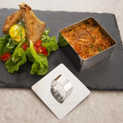 Praktyczna kwadratowa forma ze stali nierdzewnej z ubijakiem do precyzyjnego kształtowania i eleganckiego serwowania potraw. Tworzy jednolite porcje, doskonale trzyma kształt, a dzięki gładkiej powierzchni ze stali nierdzewnej potrawy łatwo się wyjmują. Idealna do tatarów, ryżu, deserów, sałatek i dodatków, a do tego nadaje się do zmywarki.