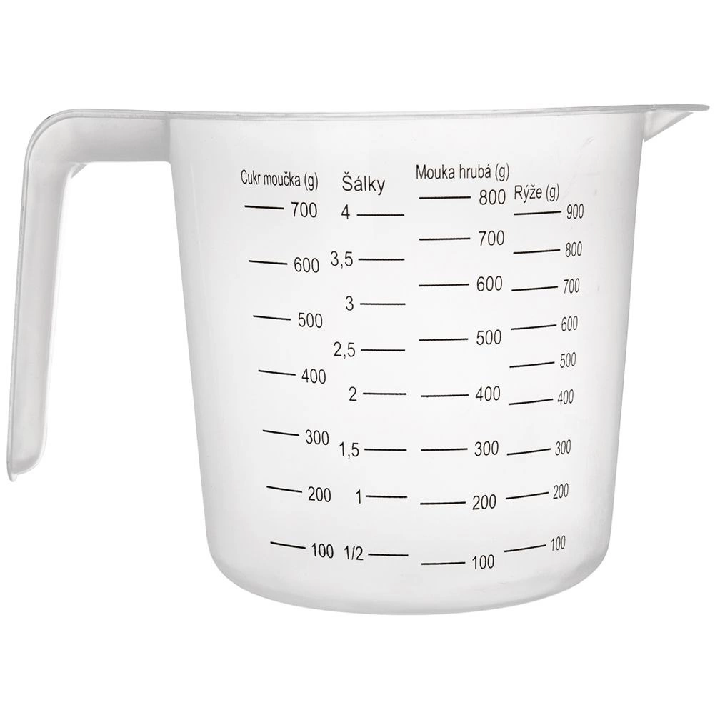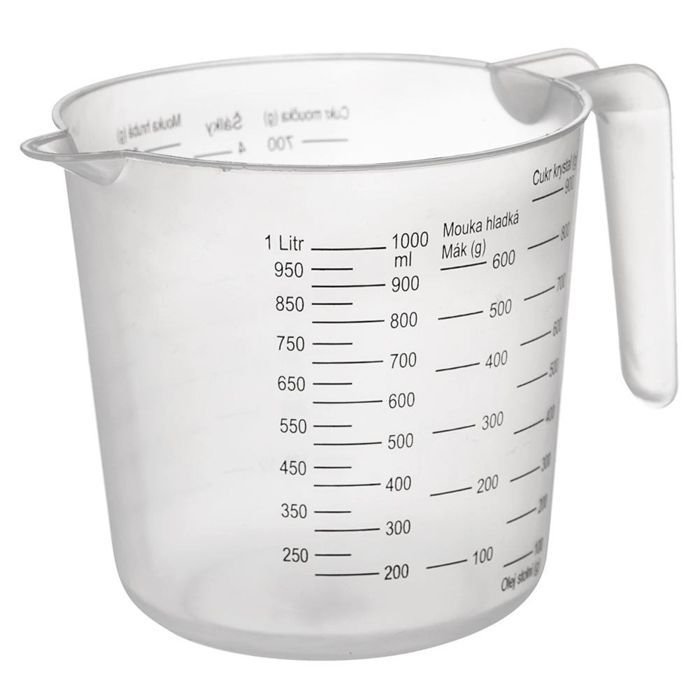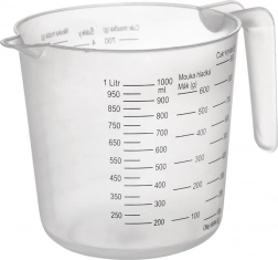 Praktyczny kuchenny kubek miarowy o pojemności 1 l w formie wygodnego dzbanka z uchem i dziobkiem. Wykonany z wytrzymałego i bezpiecznego dla zdrowia przezroczystego plastiku, jest lekki i dobrze leży w dłoni. Oferuje precyzyjne skale dla płynów i produktów sypkich oraz ułatwia odmierzanie w każdej kuchni.