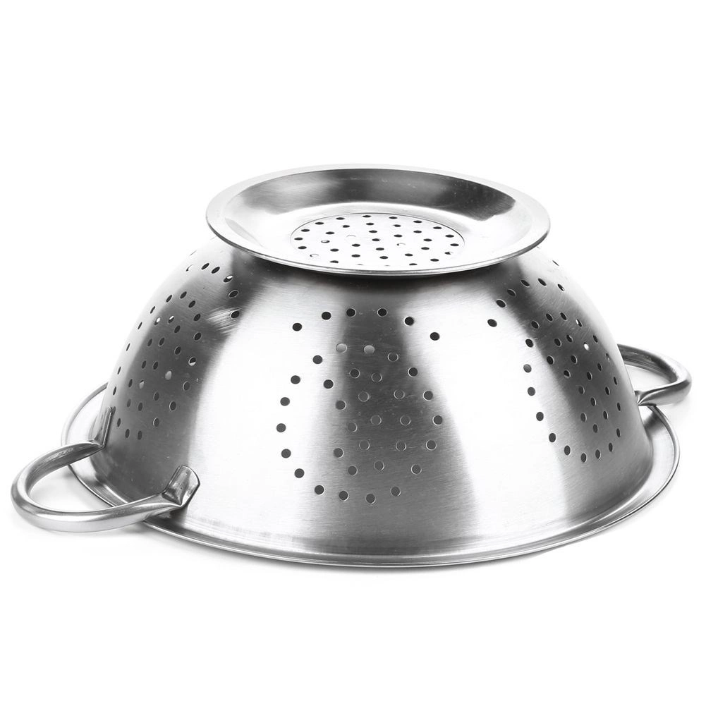 Ten wytrzymały cedzak ze stali nierdzewnej łączy praktyczny kształt głębokiej miski z podwyższoną stopką dla maksymalnej stabilności w zlewie. Dzięki gęstemu dziurkowaniu szybko i skutecznie odprowadza wodę i poradzi sobie zarówno z płukaniem owoców i warzyw, jak i z odcedzaniem makaronu, kluseczek czy ryżu.