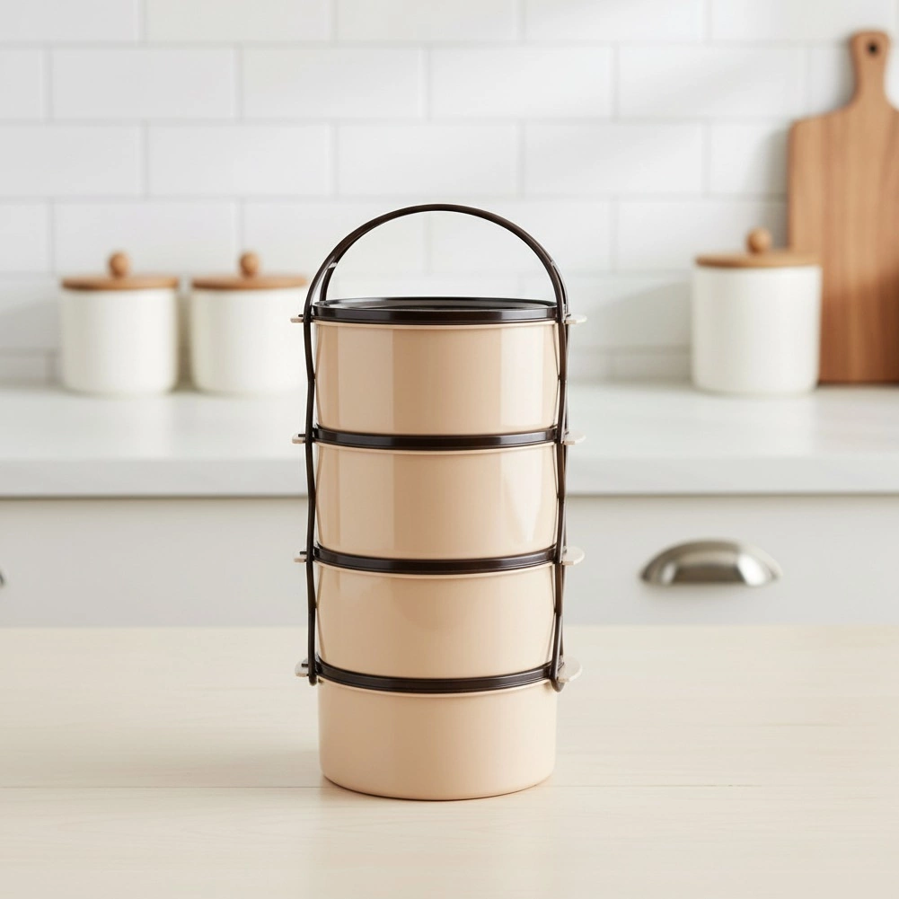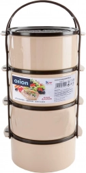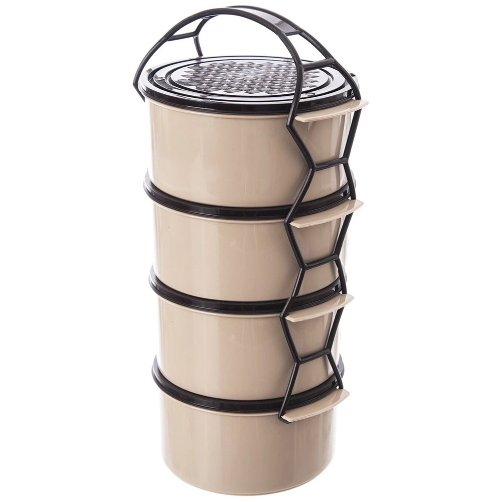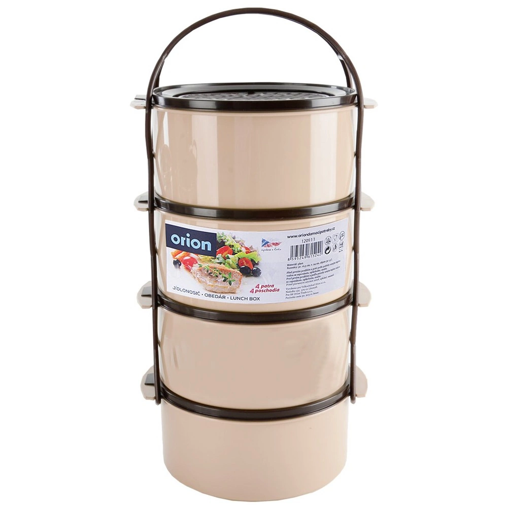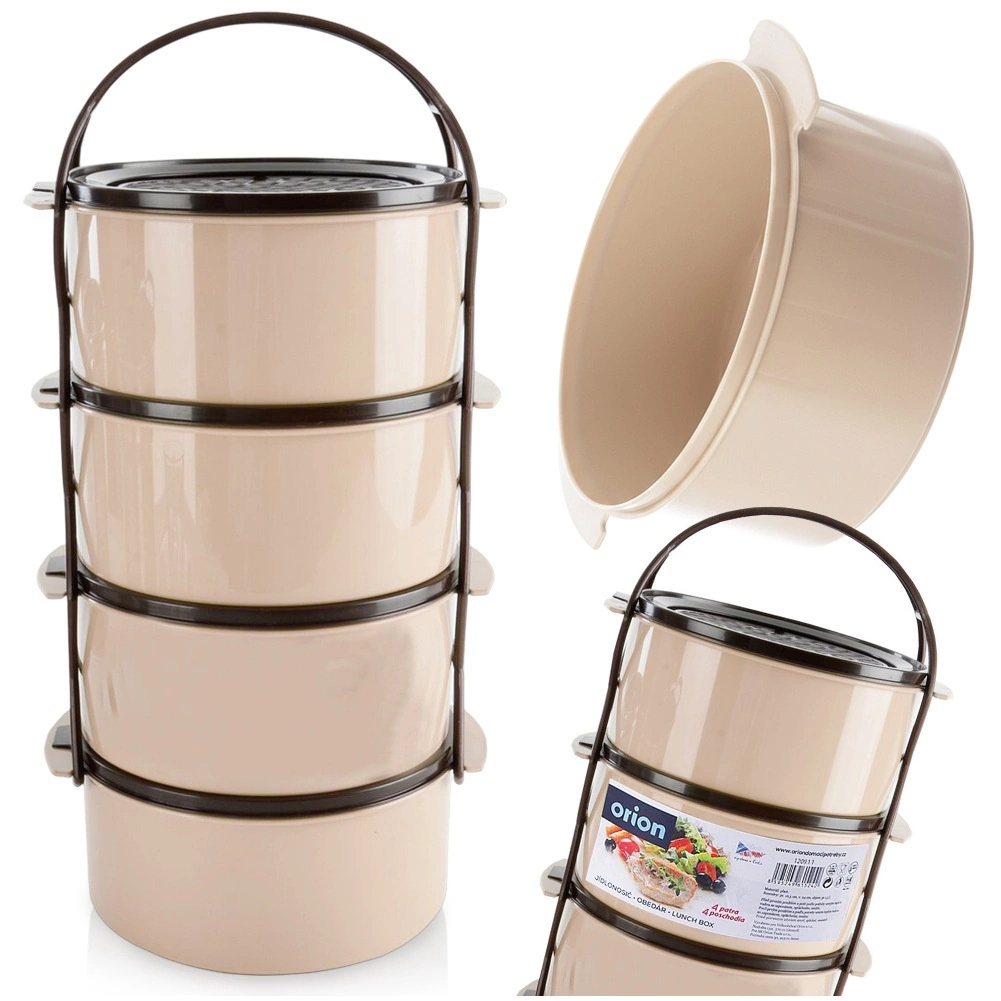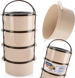 Praktyczny czteropoziomowy pojemnik na jedzenie o pojemności 4×1,5 l do przejrzystego oddzielania potraw. Ma piętrowe, sztaplowane pojemniki z pokrywkami, solidną ramę nośną z uchwytem oraz wytrzymałe wykonanie w beżowo‑brązowym kolorze. Odpowiedni do zmywarki, lodówki, zamrażarki oraz do mikrofalówki bez pokrywek.