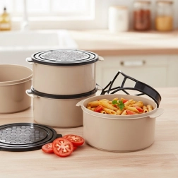 - 4 oddzielne pojemniki – higieniczne i przejrzyste przechowywanie różnych potraw.