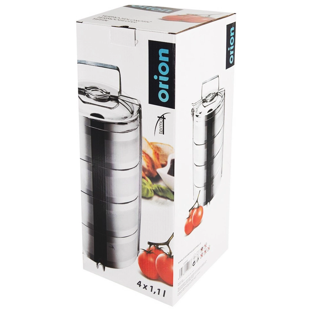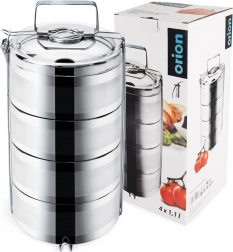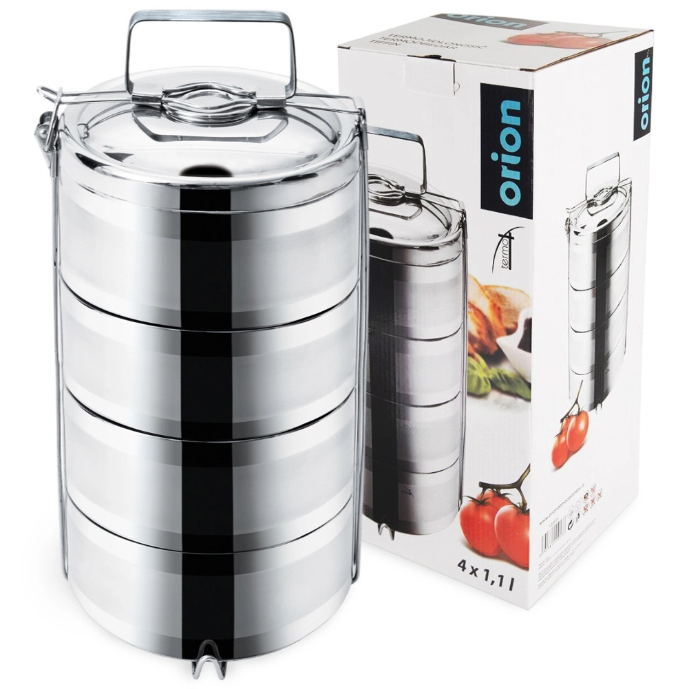 Praktyczny stalowy termos obiadowy z 4 oddzielnymi poziomami o pojemności 4×1,1 l dłużej utrzymuje potrawy w cieple lub chłodzie dzięki podwójnej ściance z izolacją próżniową. Wytrzymała stal nierdzewna, bezpieczne boczne klamry oraz wygodny uchwyt ułatwiają przenoszenie posiłków do pracy, na wycieczki i pikniki.