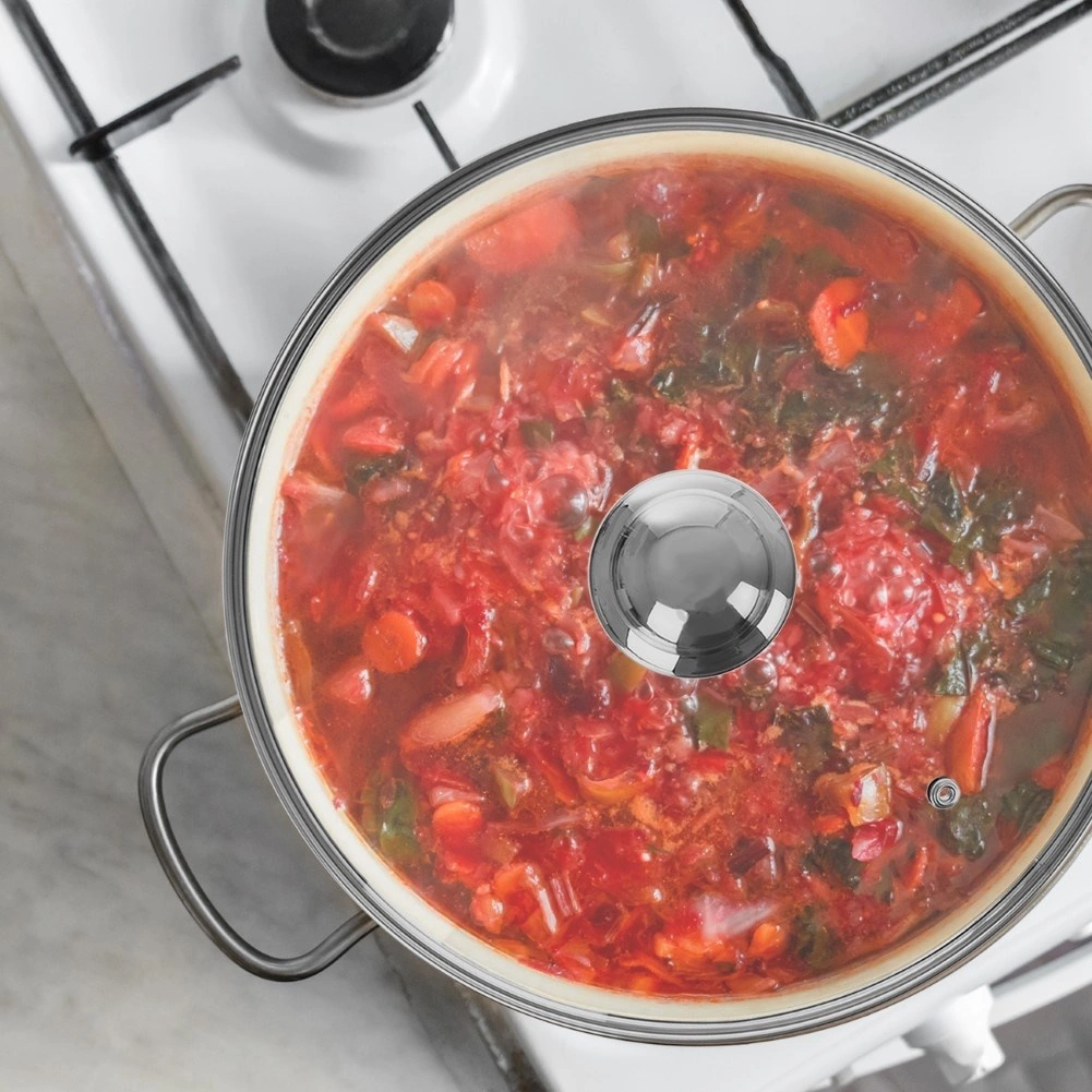 Wbudowany otwór odpowietrzający odprowadza nadmiar pary, zmniejszając ryzyko wykipienia. Ergonomiczny metalowy uchwyt dobrze leży w dłoni, a rant pomaga, by pokrywa nie ślizgała się po naczyniu i ściśle przylegała. Idealna do każdej kuchni dla szybszego i czystszego gotowania.