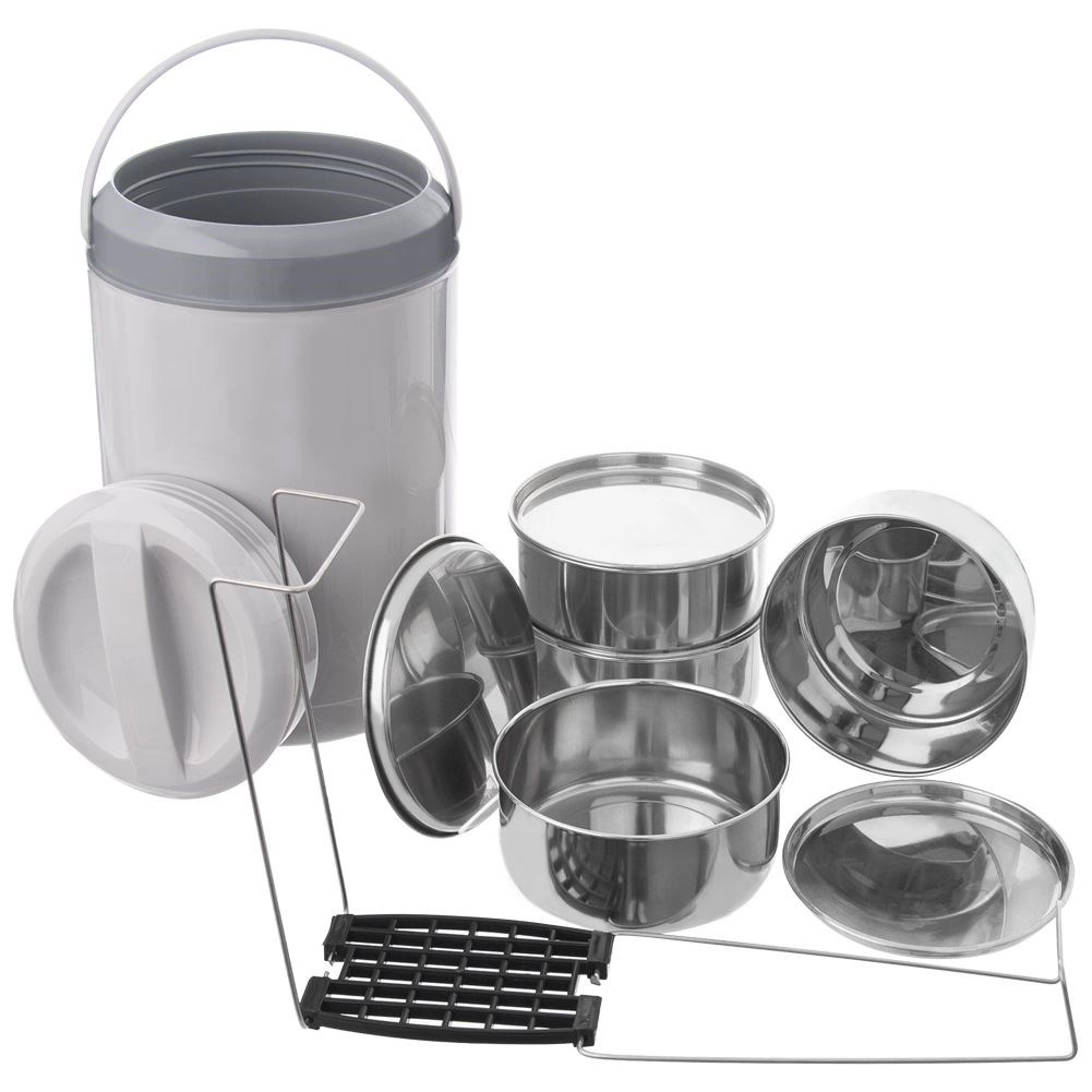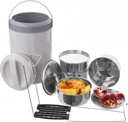 Odkryj niezawodny sposób przenoszenia całego menu w jednym zestawie. Cztery oddzielne pojemniki ze stali nierdzewnej (każdy 800 ml) z zamykanymi pokrywkami są połączone solidnym stojakiem, który zapewnia stabilne i przejrzyste sztaplowanie. Szare izolowane etui z uchwytem pomaga utrzymać temperaturę potraw i umożliwia wygodne oraz bezpieczne przenoszenie.