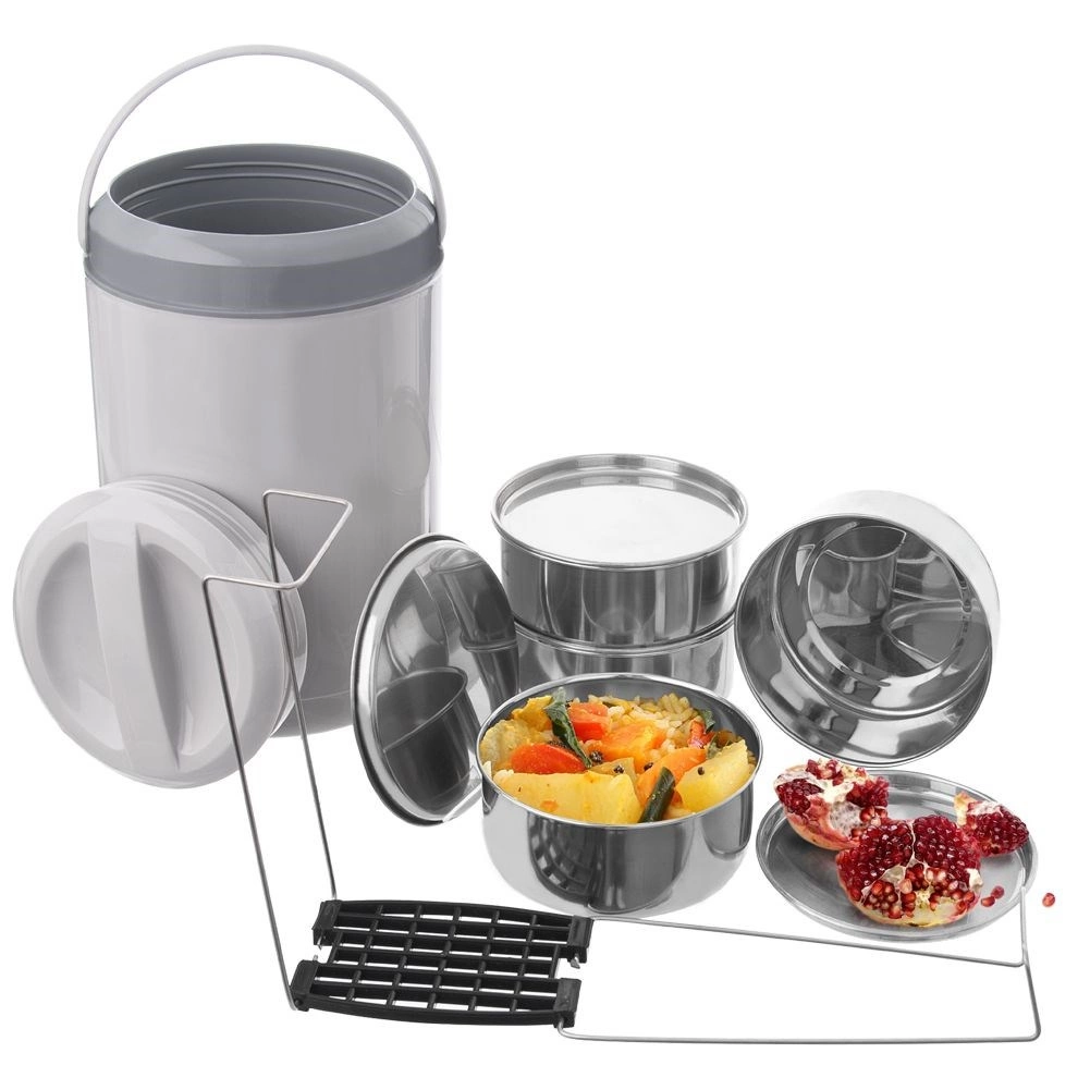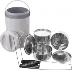 Praktyczny 4‑poziomowy termos obiadowy ze stali nierdzewnej z izolującym etui termo i wygodnym uchwytem utrzyma Twoje potrawy dłużej ciepłe lub zimne. Każda miska ma pokrywkę i pojemność 800 ml, co ułatwia oddzielne przenoszenie dań. Idealny na wycieczki, do pracy i na piknik. Stalowe miski, izolowane etui z uchwytem, bezpieczne przenoszenie i łatwe sztaplowanie w stojaku.
