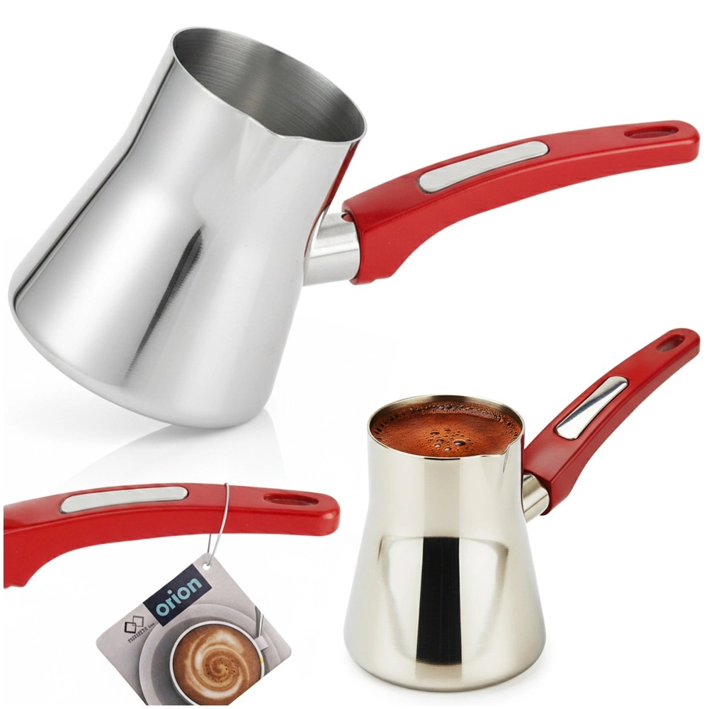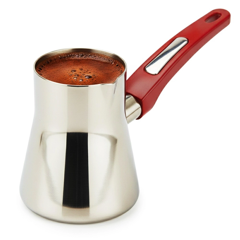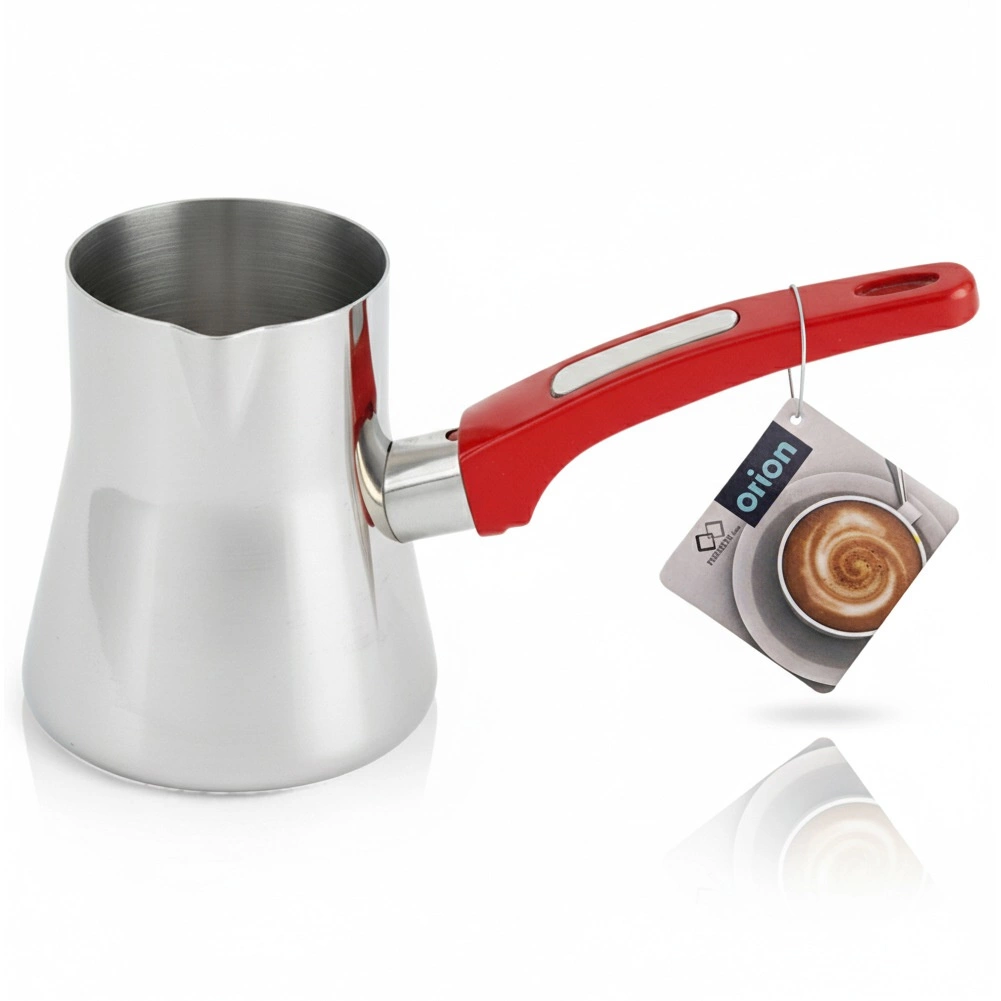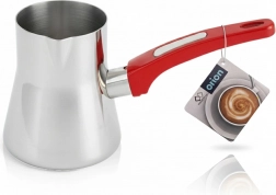 Praktyczna stalowa dzbanuszka do kawy po turecku o pojemności 330 ml z ergonomicznym czerwonym uchwytem i wylewką. Odpowiednia na kuchenki gazowe, elektryczne i ceramiczne, idealna także do podgrzewania mleka. Wykonana z wysokiej jakości stali nierdzewnej, bezpiecznej dla żywności, z możliwością mycia w zmywarce oraz specjalnym „kołnierzem” przeciwkapowym zapobiegającym przelaniu.