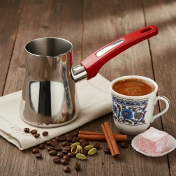 Ta elegancka stalowa dzbanuszka (cezve/ibrik) jest niezbędna do przygotowania autentycznej kawy po turecku. Pojemność 330 ml jest idealna na jedną do dwóch porcji, praktyczna wylewka zapewnia precyzyjne nalewanie bez rozlewania, a ergonomiczny czerwony uchwyt oferuje bezpieczny i wygodny chwyt.
