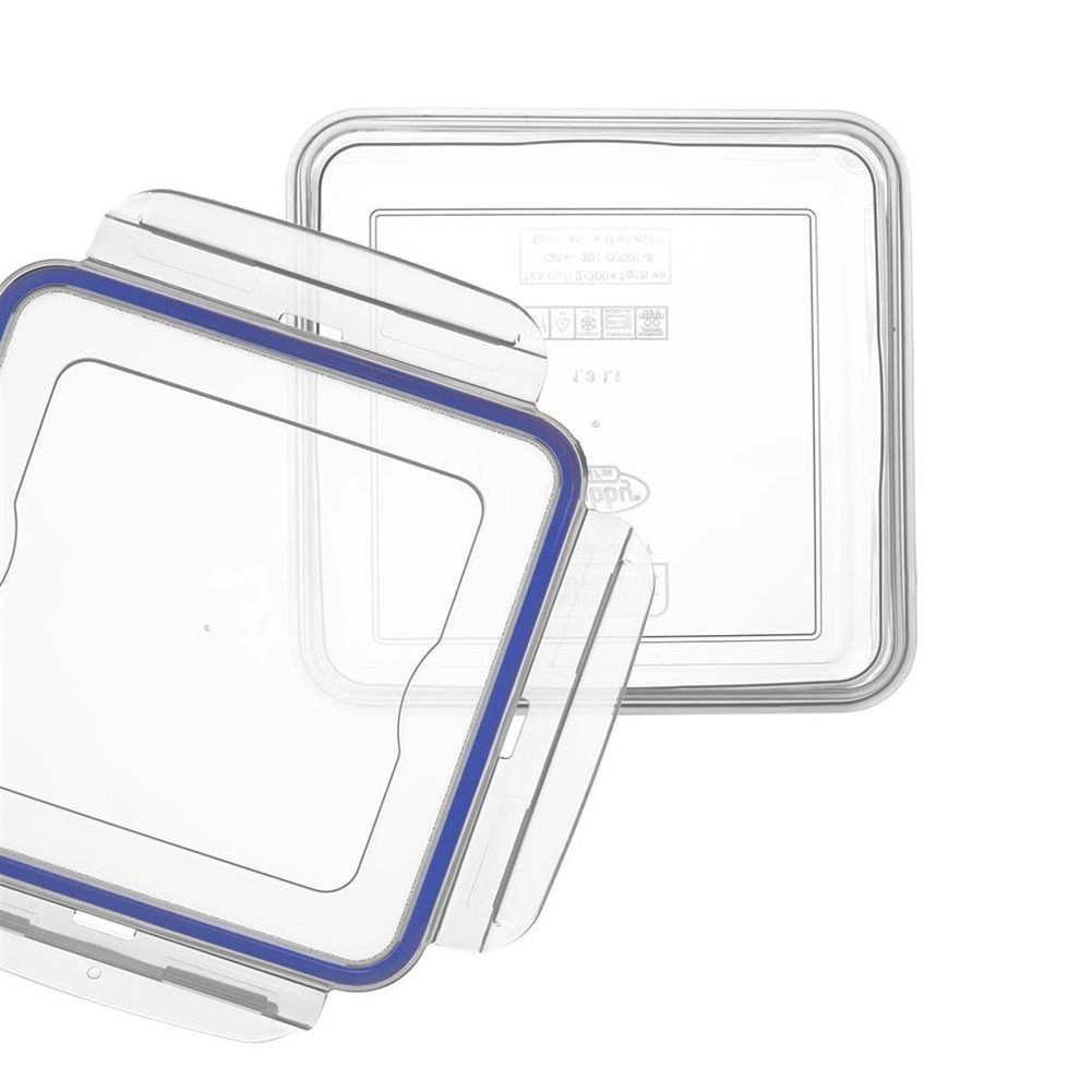 Praktyczny kwadratowy pojemnik (10 × 10 × 6 cm) z wysokiej jakości transparentnego plastiku utrzyma Twoją żywność dłużej świeżą dzięki silikonowej uszczelce i czterem klipsom zamykającym. Doskonały do codziennego użytku w domu, w pracy i w podróży – bez obaw o przeciekanie.