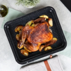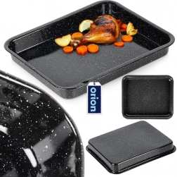 Praktyczna prostokątna brytfanna z wysokiej jakości emaliowanej stali o pojemności 4 litry i wymiarach 39,5 × 33,5 × 4,5 cm jest idealna do pieczenia mięsa, warzyw i deserów. Trwała emaliowana powierzchnia jest łatwa w czyszczeniu, potrawy się nie przypalają, a naczynie nadaje się do piekarników gazowych i elektrycznych oraz do zmywarki.