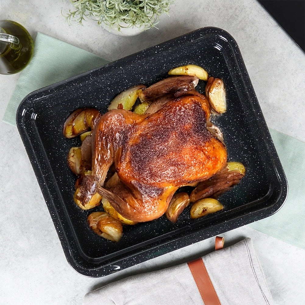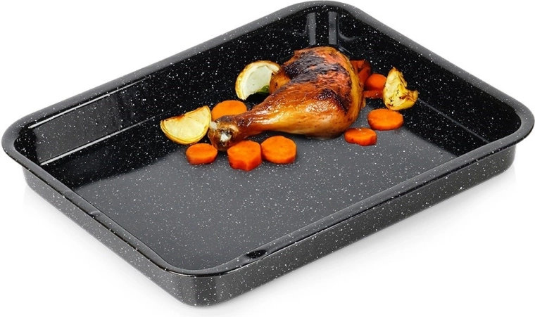 Odkryj uniwersalną brytfannę, która poradzi sobie z niedzielną pieczenią, zapiekanymi ziemniakami i domową pizzą z wysokim rantem. Solidne stalowe korpus z gładką emaliowaną (emailowaną) powierzchnią zapewnia równomierne rozprowadzanie ciepła i długą żywotność. Powierzchnia jest higieniczna, bezpieczna dla zdrowia i odpowiednia także dla alergików.