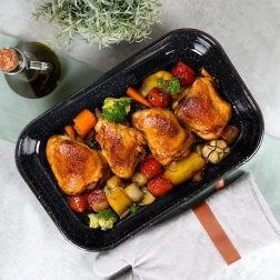 Pojemność 4,8 l i praktyczna głębokość zatrzymują soki wewnątrz potrawy – idealna do pieczenia mięsa oraz soczystych dań zapiekanych.