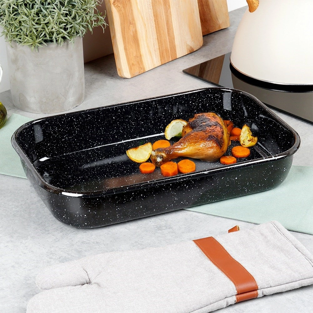 Prostokątna brytfanna z emaliowanej stali jest trwała, higieniczna i doskonale przewodzi ciepło, zapewniając równomierne wypiekanie potraw. Emalia jest bezpieczna dla zdrowia i odpowiednia również dla alergików. Dzięki uniwersalnym wymiarom 38 × 24,5 × 7 cm (wewnątrz 36 × 22,5 × 6 cm) sprawdzi się do pieczenia mięsa, warzyw, zapiekanek oraz deserów.