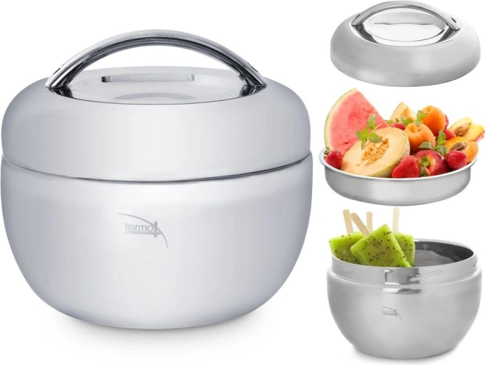 Praktyczny termos obiadowy ze stali nierdzewnej o pojemności 2 l utrzyma Twoje potrawy dłużej ciepłe lub zimne. Składa się z głównej misy, wewnętrznej miski/talerza oraz pokrywki z wygodnym uchwytem. Dzięki wysokiej jakości wykonania jest trwały, łatwy do przenoszenia i doskonale utrzymuje temperaturę do 2 godzin. Idealny do pracy, w podróży i do serwowania w domu.