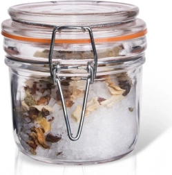 Uniwersalny szklany słoik z praktycznym zamknięciem na klips niezawodnie chroni zawartość przed wilgocią i zanieczyszczeniami. Gumowa uszczelka w pomarańczowym kolorze zapewnia doskonałą szczelność, dlatego świetnie nadaje się do przypraw, mieszanek sypkich, mielonych orzechów czy drobnych owoców, takich jak żurawina, borówki i maliny.