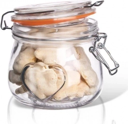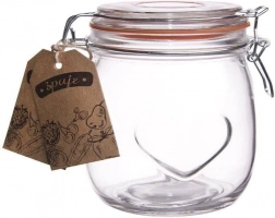 Stylowy i praktyczny szklany słoik z klipem to świetny wybór do codziennego przechowywania żywności oraz przygotowywania domowych przysmaków. Dzięki patentowemu zamknięciu z gumową uszczelką jest doskonale szczelny i chroni zawartość przed powietrzem oraz wilgocią. Grube szkło z tłoczonym sercem prezentuje się elegancko, dlatego nadaje się także jako opakowanie prezentowe na domowe konfitury czy miód.