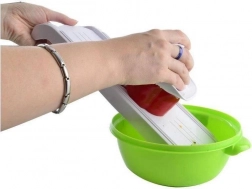 Praktyczna krajalnica do warzyw i owoców o wymiarach 36 × 12,5 × 4 cm oferuje wymienne nasadki do krojenia i tarcia, ostry nóż ze stali nierdzewnej oraz uchwyt bezpieczeństwa dla wygodnej i bezpiecznej pracy. Dzięki solidnej konstrukcji, skośnemu kształtowi i nacięciu do oparcia o brzeg miski krojenie jest szybkie, precyzyjne i bez wysiłku.