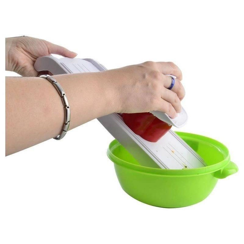 Uniwersalna krajalnica ułatwia przygotowanie warzyw i owoców do sałatek, dodatków oraz domowych chipsów. Wytrzymałe plastikowe korpus w białym kolorze i ostrza ze stali nierdzewnej zapewniają długą żywotność i niezawodną pracę. Uchwyt bezpieczeństwa chroni palce i umożliwia wygodne tarcie oraz krojenie mniejszych kawałków.