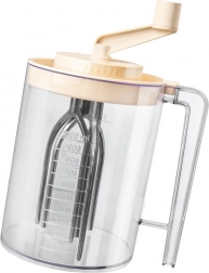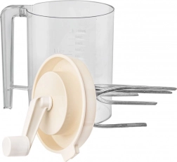 Praktyczny ręczny mikser z korbką i zintegrowaną miarką o pojemności 1,5 l do łatwego ubijania, mieszania i przygotowywania ciasta. Dzięki przezroczystemu naczyniu z dokładną skalą w ml i litrach, solidnemu uchwytowi oraz pokrywie przeciwrozpryskowej szybko i czysto przygotujesz bitą śmietanę, bezę z białek, ciasto naleśnikowe oraz sosy. Mechaniczny napęd bez prądu, wytrzymałe materiały i łatwa pielęgnacja czynią mikser niezawodnym pomocnikiem w każdej kuchni.