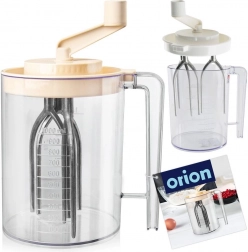 Ręczny mikser ORION łączy trzepaczkę, mieszadło i miarkę w jednym. Przezroczyste naczynie ze skalą (100–1000 ml oraz 1/4, 1/2, 3/4, 1 l) ułatwia precyzyjne dozowanie składników. Mechaniczna korbka napędza wewnętrzne mieszadła, dzięki czemu mieszasz wydajnie, bez potrzeby użycia prądu i bez rozpryskiwania dzięki zamkniętej pokrywie.