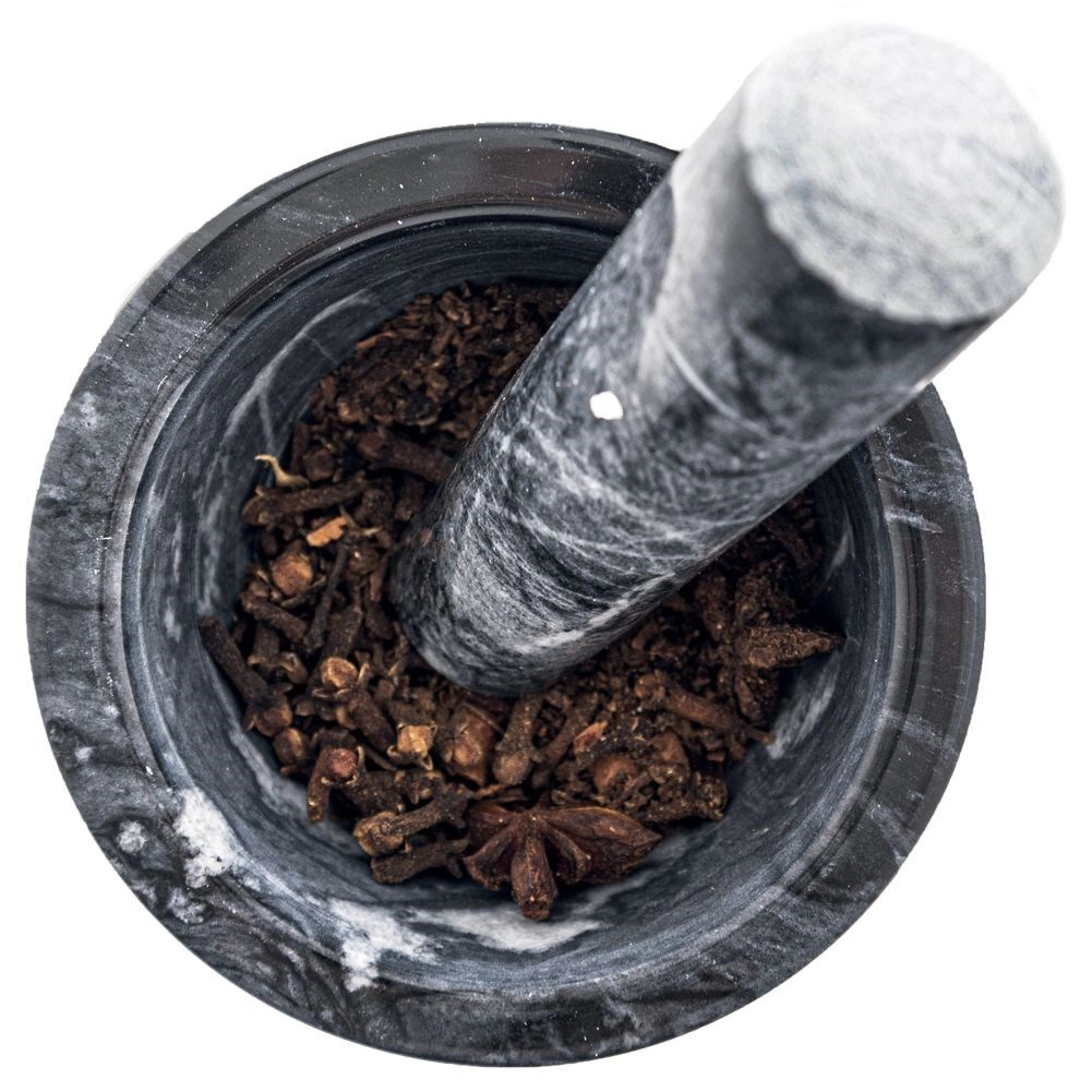 Wewnętrzna nieszlifowana powierzchnia miski oraz dolna część tłuczka zapewniają idealne tarcie. Łatwo wydobywa aromat przypraw i ziół oraz uwalnia olejki eteryczne.