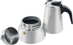 Elegancka stalowa kawiarka moka o pojemności 450 ml do przygotowania tradycyjnego włoskiego espresso dla maksymalnie 9 filiżanek. Oferuje trwałe wykonanie ze stali nierdzewnej, wygodny ergonomiczny uchwyt, bezpiecznikowy zawór nadciśnieniowy oraz łatwe czyszczenie, w tym możliwość mycia w zmywarce. Odpowiednia do wszystkich typów kuchenek poza indukcją.