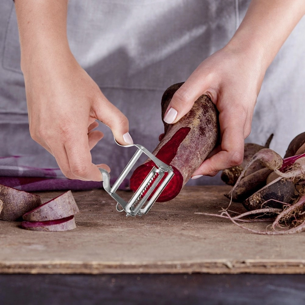 Ta kompaktowa obieraczka z wysokiej jakości stali nierdzewnej bez trudu radzi sobie z codziennym przygotowywaniem żywności. Dwa obrotowe ostrza pozwalają na klasyczne gładkie obieranie ziemniaków, jabłek czy marchwi oraz na tworzenie podłużnych pasków julienne z cukinii, ogórka lub marchwi do sałatek i dekoracji. Boczne ostrze poradzi sobie z usuwaniem oczek i niedoskonałości.
