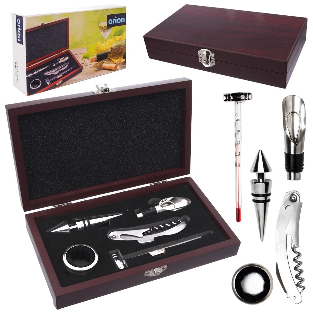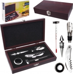 Ten kompletny zestaw akcesoriów do wina zamienia każde otwarcie butelki w mały rytuał. Narzędzia z wytrzymałej stali nierdzewnej uzupełnione o precyzyjny szklany termometr i praktyczne uszczelnienia gwarantują komfort, czystość i profesjonalną prezentację. Przechowywanie w ciemnym drewnianym boxie chroni narzędzia i nadaje zestawowi elegancki, prezentowy wygląd.