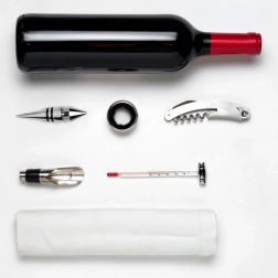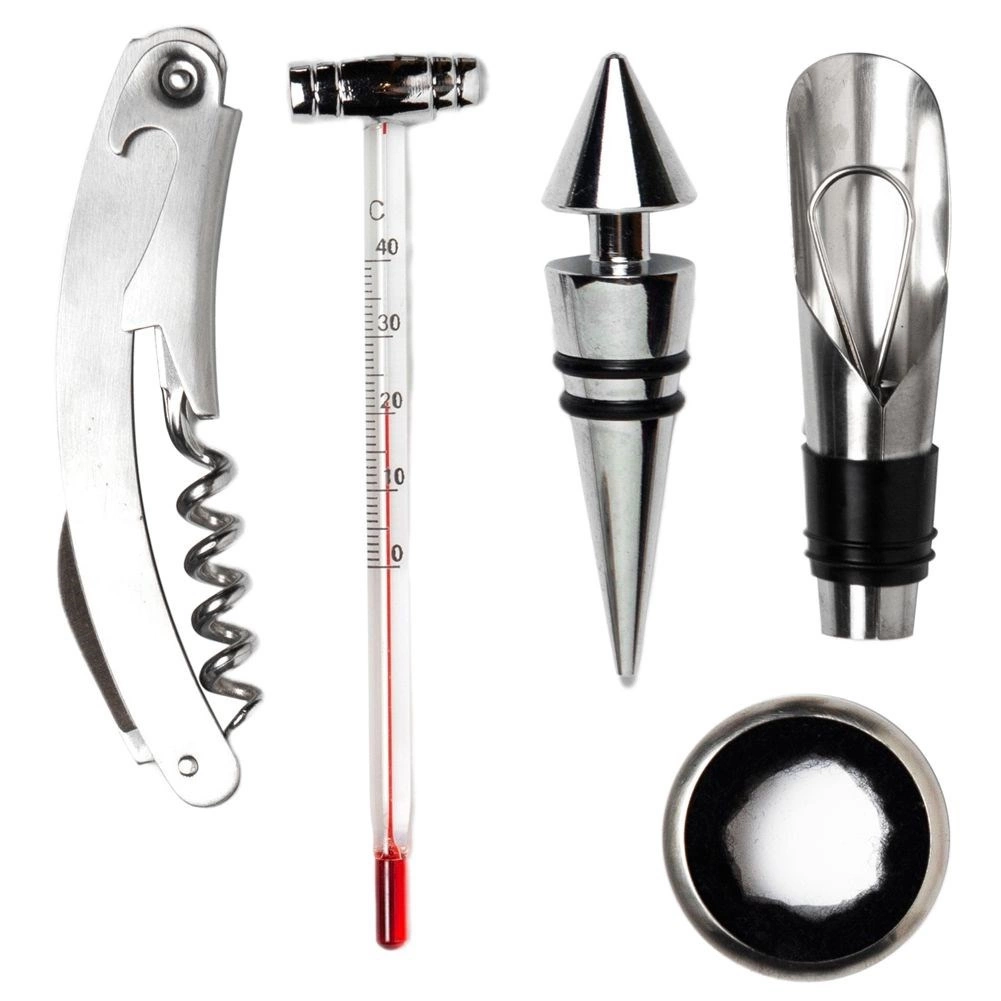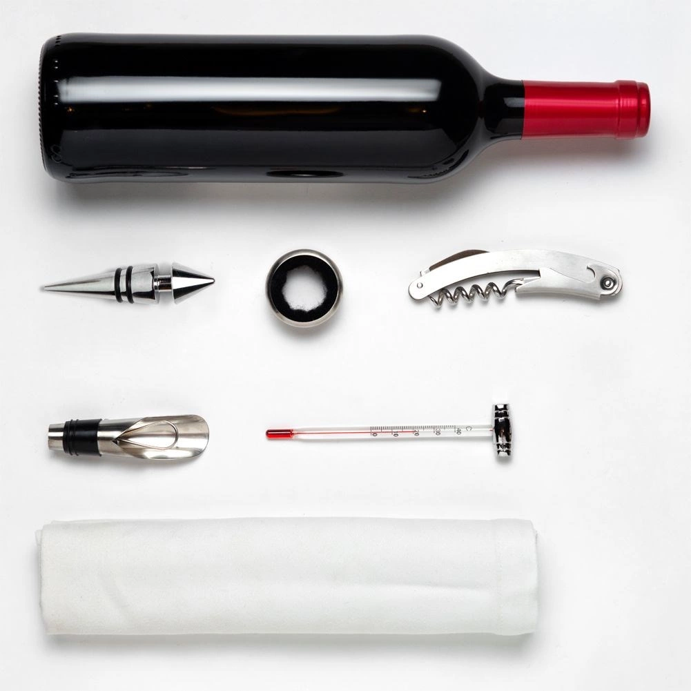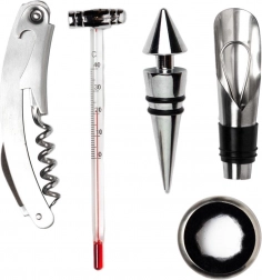 W opakowaniu znajdziesz wszystko, czego potrzebujesz: otwieracz z wbudowanym nożykiem do łatwego usuwania folii, nalewak do płynnego i niekapiącego nalewania, korek do zachowania świeżości, pierścień ociekowy przeciw plamom oraz termometr do kontroli idealnej temperatury serwowania.