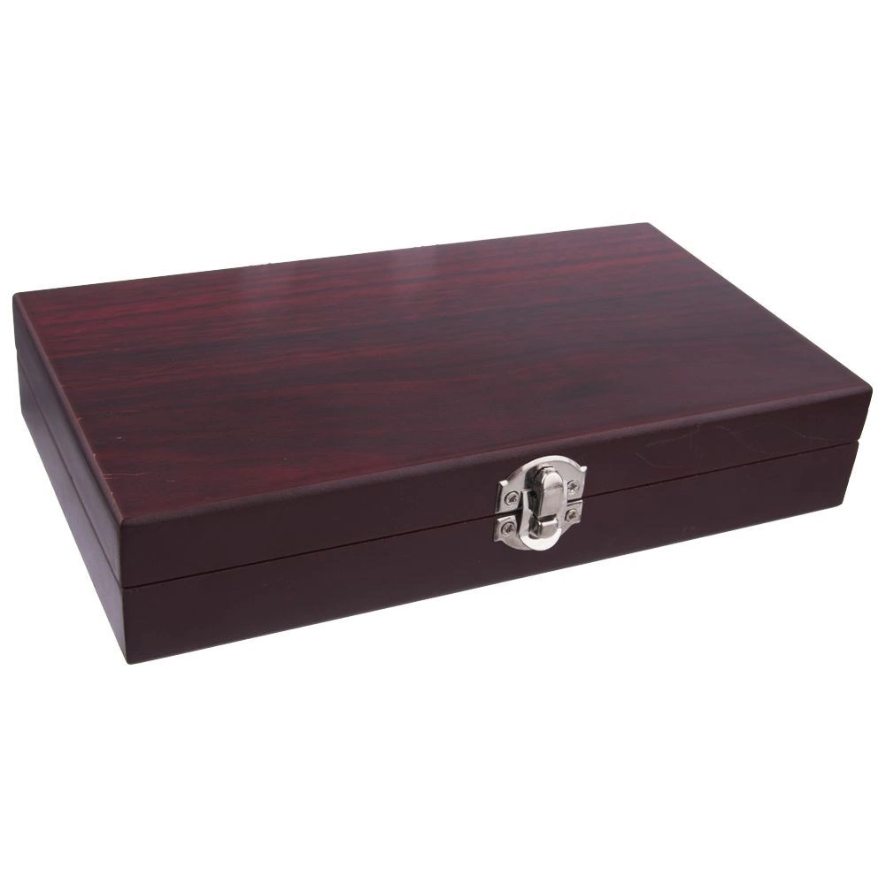Solidne drewniane pudełko z ciemnym wykończeniem i metalowym zapięciem chroni akcesoria i nadaje zestawowi charakter prezentowy.
