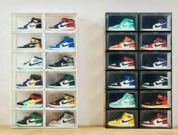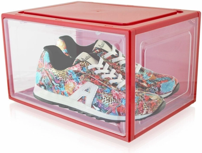 Utrzymuj porządek w obuwiu z eleganckimi organizerami w intensywnie czerwonym kolorze. Przednie drzwiczki z magnesami łatwo się otwierają i pewnie trzymają zamknięcie, dzięki czemu buty pozostają chronione przed kurzem. Trzy przezroczyste boki umożliwiają natychmiastową identyfikację zawartości bez konieczności otwierania pudełka.